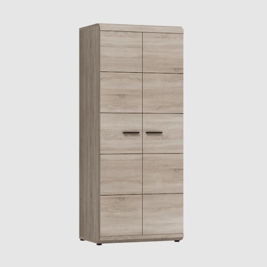 Crafted from high-quality laminated board, the Lecco wardrobe ensures exceptional durability and a smooth oak-effect texture. The two hinged doors open to reveal a spacious interior equipped with two sturdy shelves and a full-width hanging rail — ideal for clothing, shoes, and accessories. Finished with sleek metal handles, it offers a timeless aesthetic while maintaining an understated elegance.