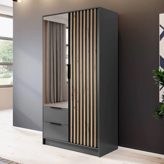Newberry Mirrored Wardrobe with 2 Hinged Doors in a sleek Graphite finish. This compact wardrobe is a stylish and practical addition to your bedroom, offering both form and function. The Graphite finish adds a touch of modern elegance, making it a versatile piece that can complement various interior styles. With two hinged doors, this wardrobe provides essential storage space for your clothing, accessories, and other items. Additionally, the mirrored doors add a touch of sophistication and functionality, allowing you to check your outfit as you get ready. Its 105cm width is ideal for smaller bedrooms or as an additional storage solution. The Newberry Mirrored Wardrobe in Graphite is a versatile and eye-catching piece that helps you keep your bedroom organized and adds a touch of style to your space. Elevate your bedroom decor with this exquisite wardrobe and experience the perfect fusion of style and functionality in your living space.