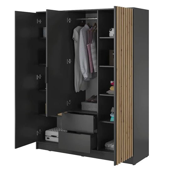 The Newberry 155cm Wardrobe blends modern graphite styling with warm oak-effect slat detailing, creating a premium centrepiece for contemporary bedrooms. With its full-length mirrored door, sleek profile and high-capacity interior, this wardrobe brings both visual impact and functional organisation into any space.