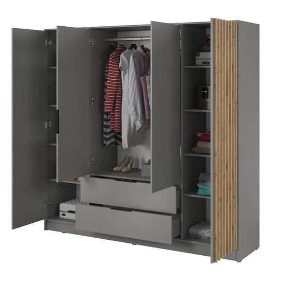 Newberry Wooden Wardrobe with 4 Hinged Doors in a sleek Grey finish. This spacious wardrobe is a stylish and practical addition to your bedroom, offering both form and function. The Grey finish adds a touch of modern elegance, making it a versatile piece that can complement various interior styles. With four hinged doors, this wardrobe provides ample storage space for your clothing, accessories, and other items. Its generous 206cm width ensures that you have plenty of room to keep your wardrobe organized. The Newberry Wooden Wardrobe in Grey is a versatile and eye-catching piece that helps you keep your bedroom tidy. Elevate your bedroom decor with this exquisite wardrobe and experience the perfect fusion of style and functionality in your living space.