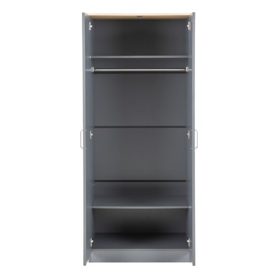 The wardrobe features a modern Grey finish with an Oak effect top.