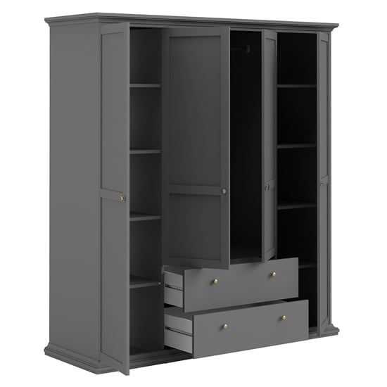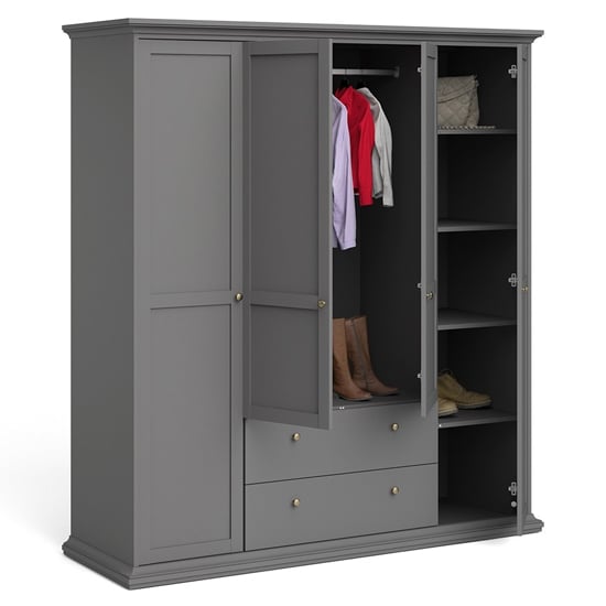 Designed for practicality and aesthetic balance, the Paroya Wardrobe features four hinged doors and two spacious drawers for effortless storage. The soft matt grey finish complements both classic and contemporary interiors, while smooth drawer runners and adjustable hinges ensure seamless operation.