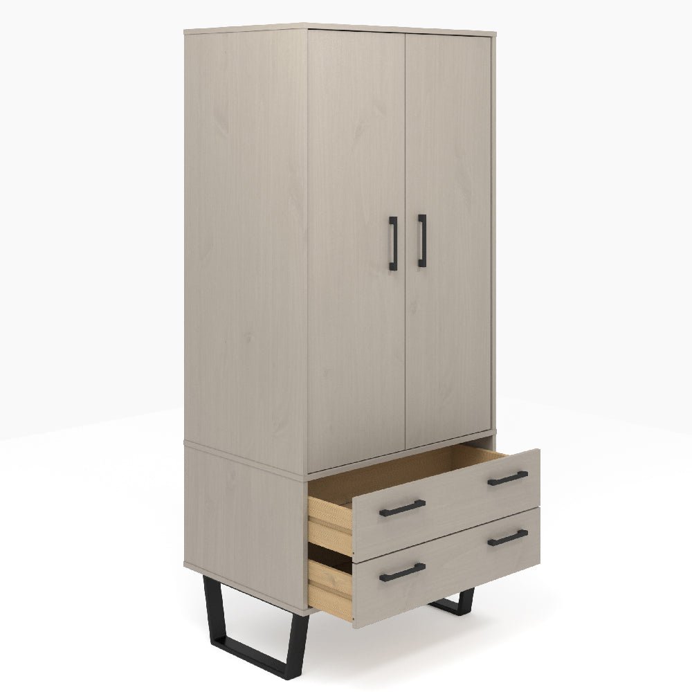 The CHOICEWARDROBE Tilston Wooden Wardrobe delivers sharp contrast and functional elegance through its clean white structure accented with bold black detailing. Designed to sit comfortably in modern bedrooms, this wardrobe balances visual clarity with everyday practicality.
