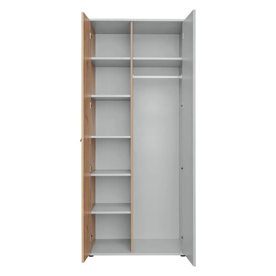Behind the two hinged doors, the internal layout is deliberately structured for long-term use. A dedicated hanging rail supports everyday garments and outerwear, while multiple shelves allow clear separation of folded clothing, accessories, and seasonal items. This considered configuration supports tidy living without unnecessary complexity.
