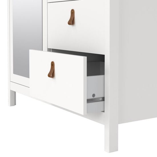 The Barcila Mirrored Wardrobe offers premium practicality in a compact design. The mirror enhances room brightness and depth, making it ideal for smaller bedrooms or apartments. The drawers and hanging space ensure efficient organization, while the white finish maintains a fresh, timeless aesthetic.