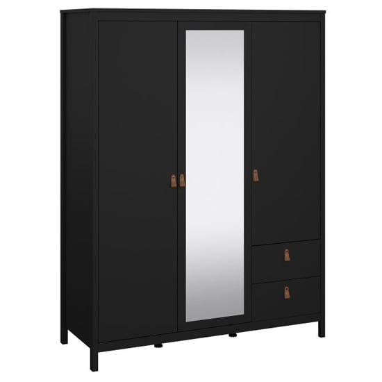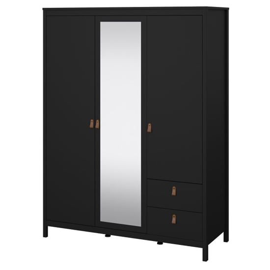 Transform your bedroom into a modern sanctuary with the CHOICEWARDROBE Barcia Mirrored 3 Door Wardrobe — a fusion of bold design and refined practicality. Finished in sleek matte black and accentuated by tan leather-style handles, this wardrobe exudes understated luxury. Its mirrored centre door enhances light and depth, while the drawers provide accessible, versatile storage for everyday essentials.