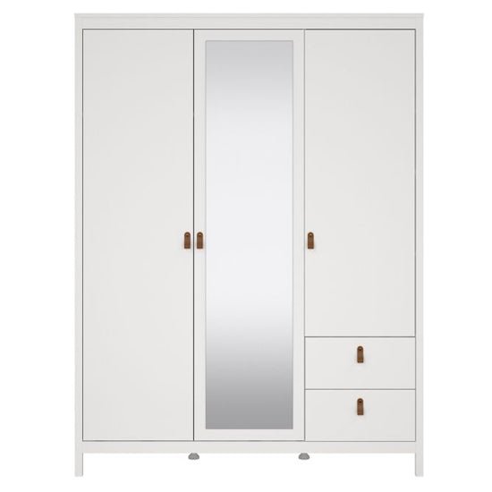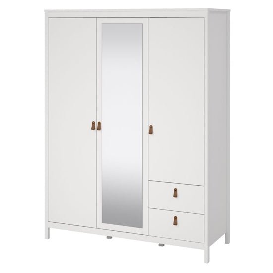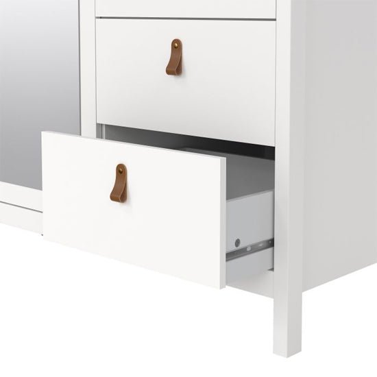 The Verona Wardrobe captures understated luxury — its clean white lines and tan handle accents bring warmth and texture to any modern bedroom. The mirrored front enhances light and depth, while the integrated drawers and spacious interior offer exceptional practicality. Designed for those who appreciate beauty and order in equal measure.
