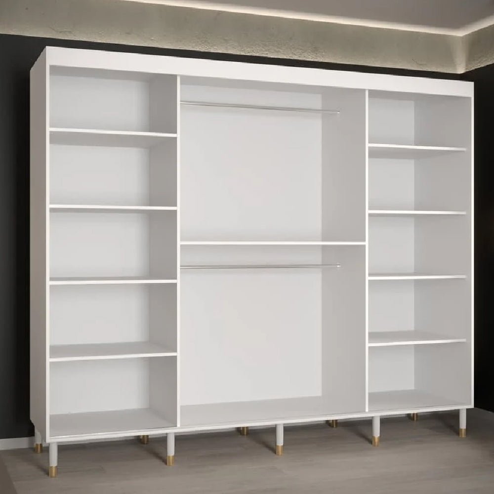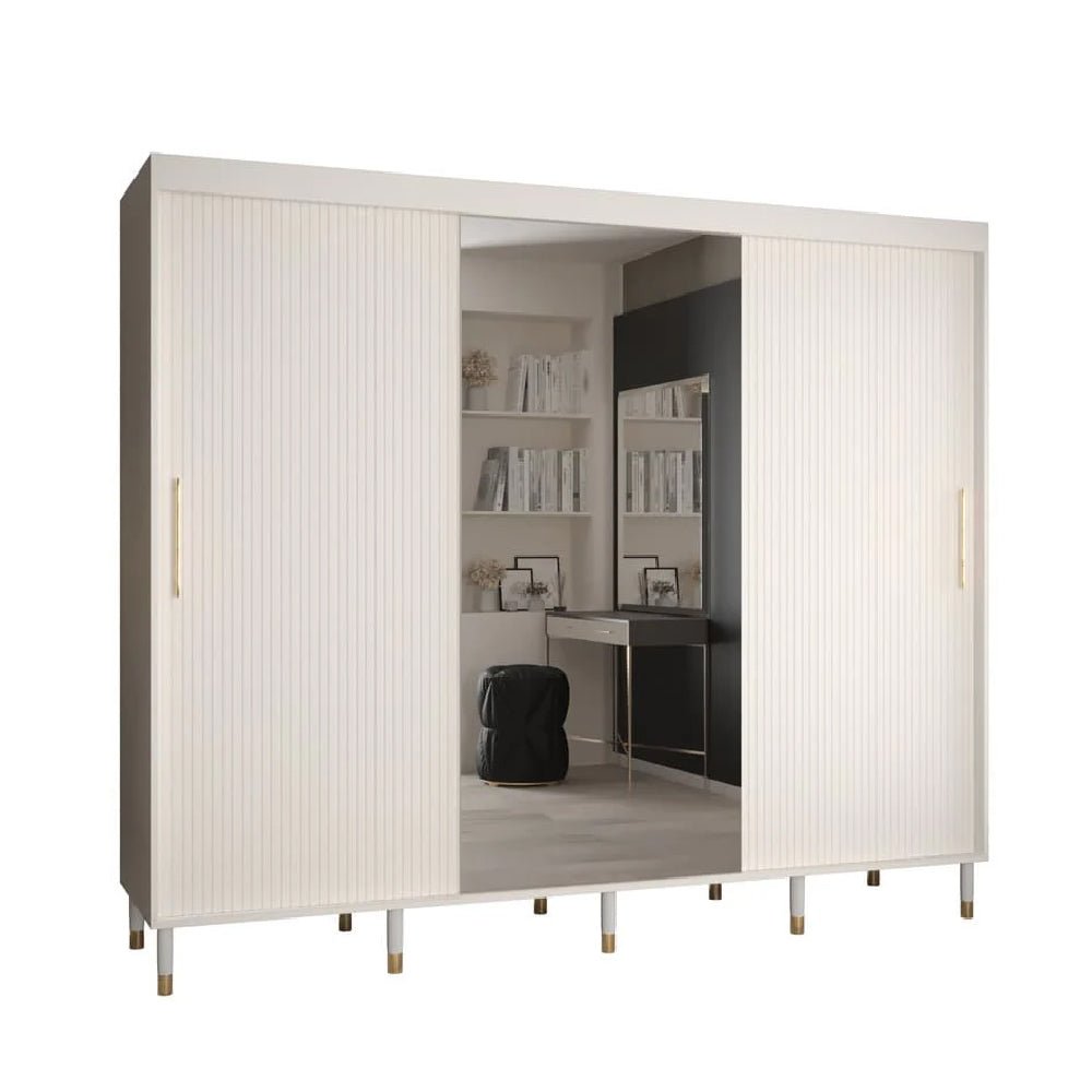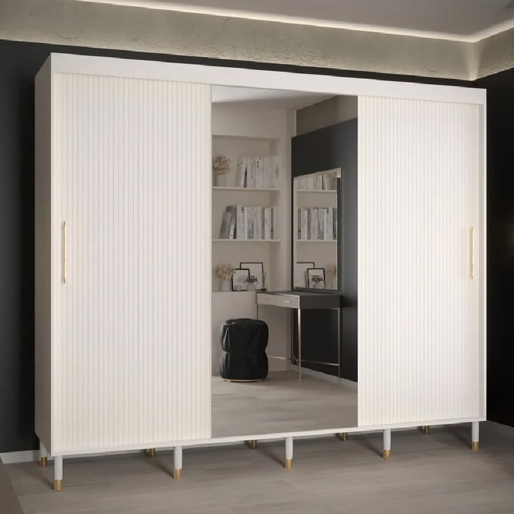 CHOICEWARDROBE Millwall 250cm 3 Door Mirrored Sliding Wardrobe – White Ribbed Finish with Gold Handles | Luxury Modern Design & Spacious Storage