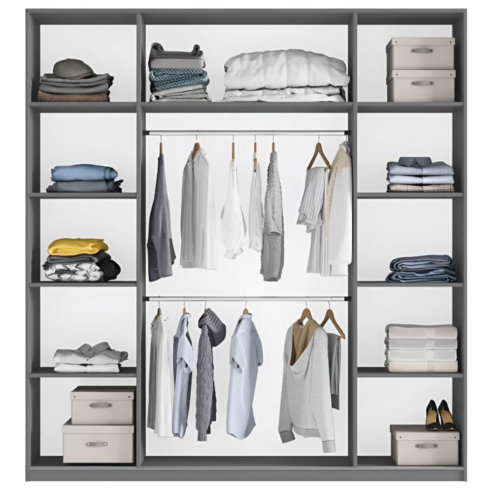 - Internal Storage: 9 Shelves, 2 Hanging Rails