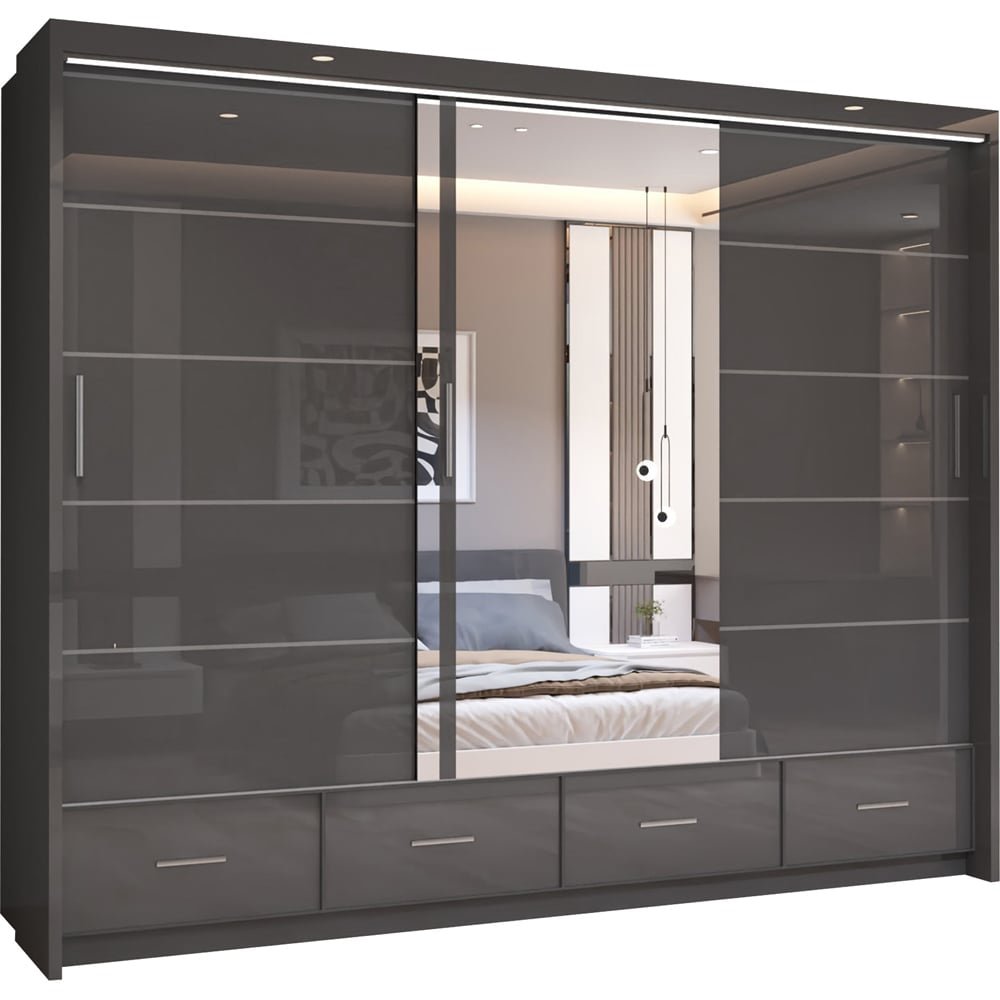 Sycylia Grey High Gloss 3 Door 4 Drawer Mirrored Wardrobe 255cm