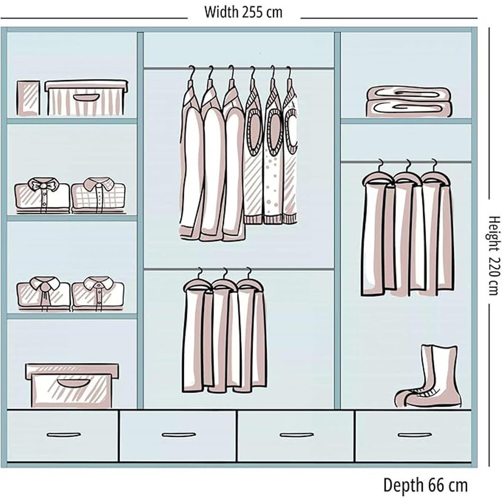 Internally, the layout is engineered for real-world organisation. Multiple shelving zones are combined with four generously sized drawers and dedicated hanging rails, allowing clear separation between folded clothing, accessories, and longer garments. Integrated LED lighting softly illuminates the interior, ensuring visibility and ease of use at any time of day.