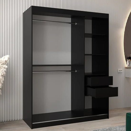 Upgrade your bedroom with the CHOICEWARDROBE Tavira 150cm Black Mirrored Sliding Door Wardrobe — a bold statement of elegance, modern design, and intelligent storage. Its matte black finish delivers a sophisticated contrast, while the full-length mirrored doors enhance light and depth in any space.