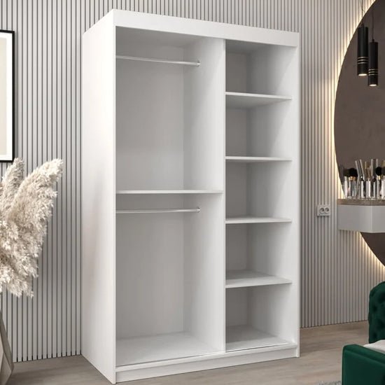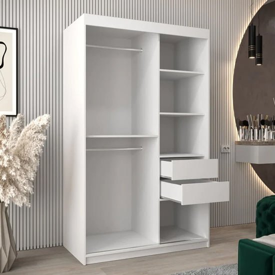 The Vevey II 120cm sliding mirror wardrobe is designed for compact bedrooms where clarity, light, and efficient storage are essential. Finished in crisp white, it delivers a clean, contemporary aesthetic that integrates effortlessly into modern interiors.