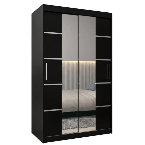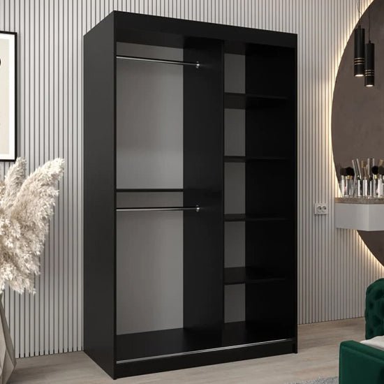 The CHOICEWARDROBE Vevey III Black 120cm Mirrored Sliding Door Wardrobe is specified and supplied by CHOICEWARDROBE, the UK’s leading wardrobe specialist. Designed for compact bedrooms and space-efficient layouts, this wardrobe combines reflective surfaces with a dark, contemporary finish in a controlled, functional form.
