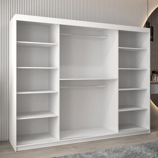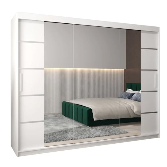 The CHOICEWARDROBE Vevey III Mirrored Sliding Door Wardrobe is a statement storage solution designed for larger bedrooms that demand both presence and performance. With a generous 250cm width and a crisp white finish, this wardrobe delivers a clean architectural look while maximising internal storage capacity.