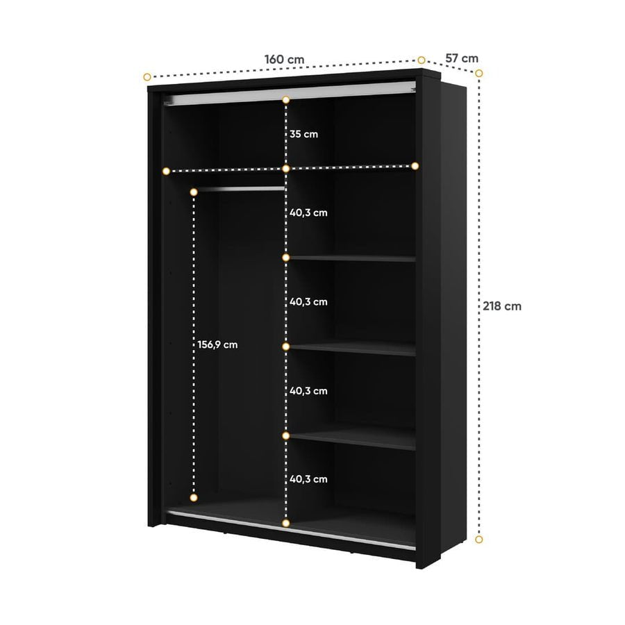 This wardrobe features a practical internal configuration with a full-length hanging rail for jackets, shirts, and dresses, alongside shelving for folded clothing and accessories. The layout is designed to maximise usable storage within a 160cm width without overcrowding the interior.