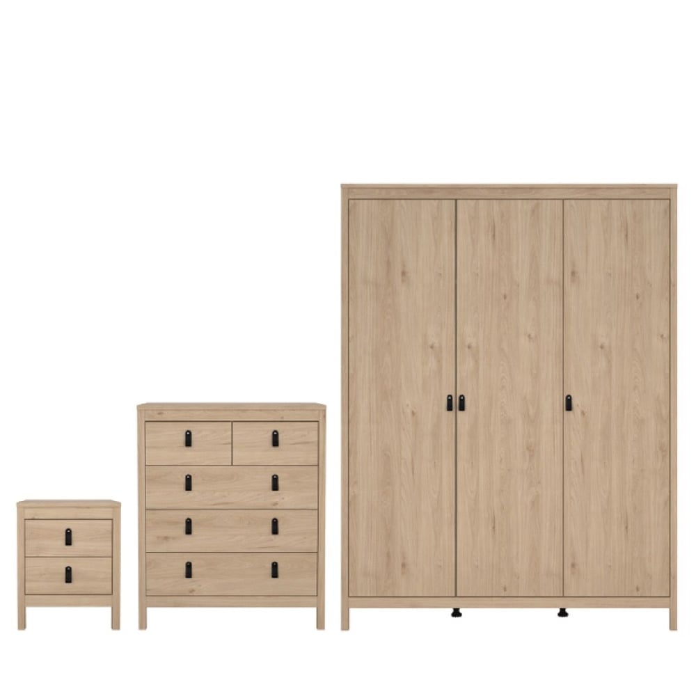 - Complete Set: Includes 3-door wardrobe, 5-drawer chest, and 2-drawer bedside cabinet