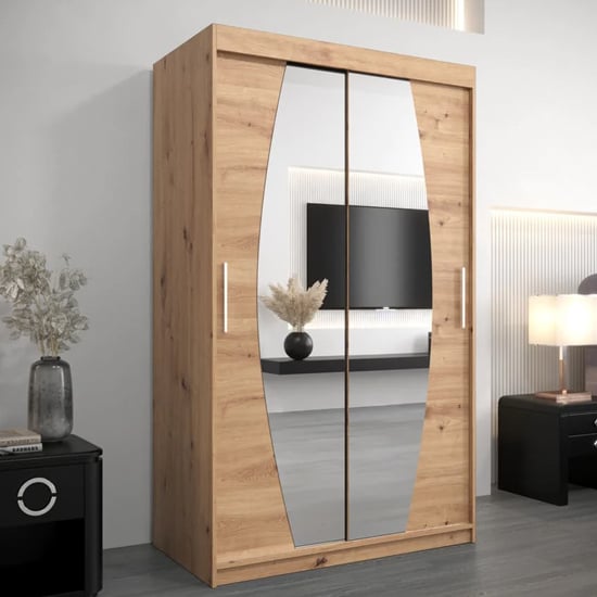 - Finish: Artisan Oak wood-effect with curved mirrored door panels
