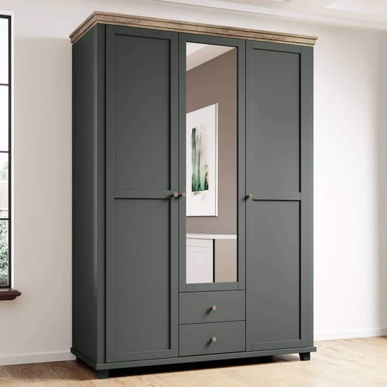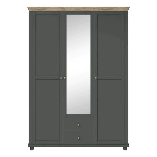 The CHOICEWARDROBE Norrin Deep Green & Oak Mirrored Wardrobe brings together modern country character and structured storage in a refined, architectural form. Finished in a rich deep green tone with contrasting Lefkas oak detailing, this three-door wardrobe introduces depth, warmth, and visual confidence to contemporary bedrooms.