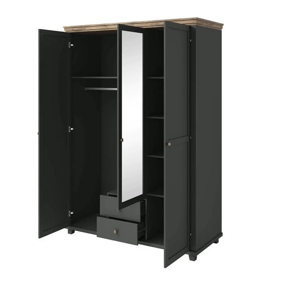 Designed for everyday practicality as well as visual impact, the Norrin wardrobe features three hinged doors, including a mirrored central panel that enhances natural light and provides full-length dressing convenience without dominating the room.