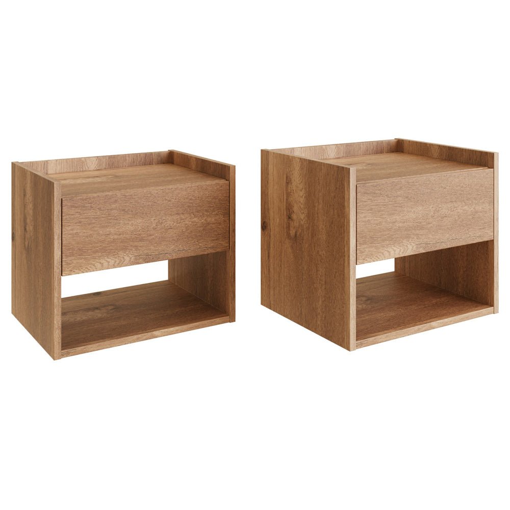 Each cabinet is constructed from wood-based panels with a durable oak-effect finish designed for everyday bedroom use. The wall-mounted configuration relies on secure fixing to a suitable wall structure, ensuring stability and long-term performance when installed correctly.