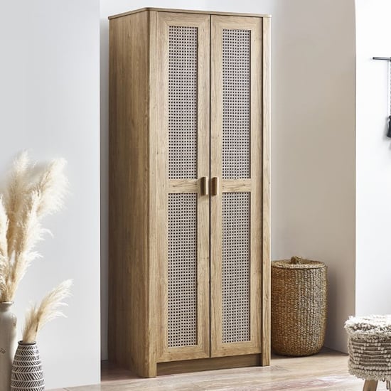 Bring warmth, texture, and timeless beauty into your bedroom with the CHOICEWARDROBE Sumter Oak & Rattan 2 Door Wardrobe. Combining a natural oak wooden frame with woven rattan-style cane panels, this piece captures the relaxed elegance of modern bohemian interiors. Its airy, organic aesthetic complements contemporary, coastal, and Scandinavian spaces alike.