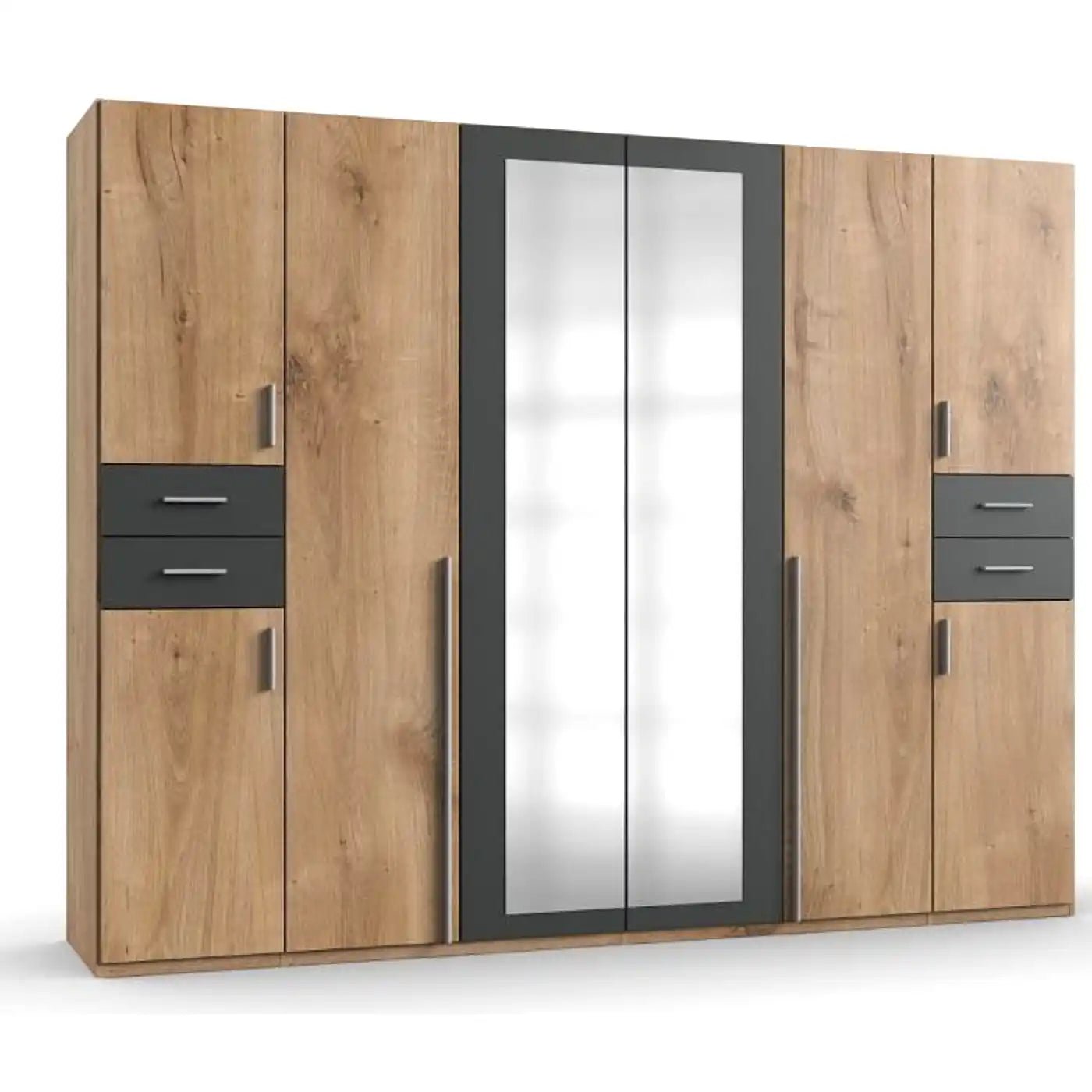 The FENTON planked oak 6 Door wardrobe has a sleek and contemporary look,finished with Mirrored door. The wardrobe has trendy handles which gives the wardrobe a modern look. The wardrobe has 2 hanging rail and total 8 shelves divide in four section.