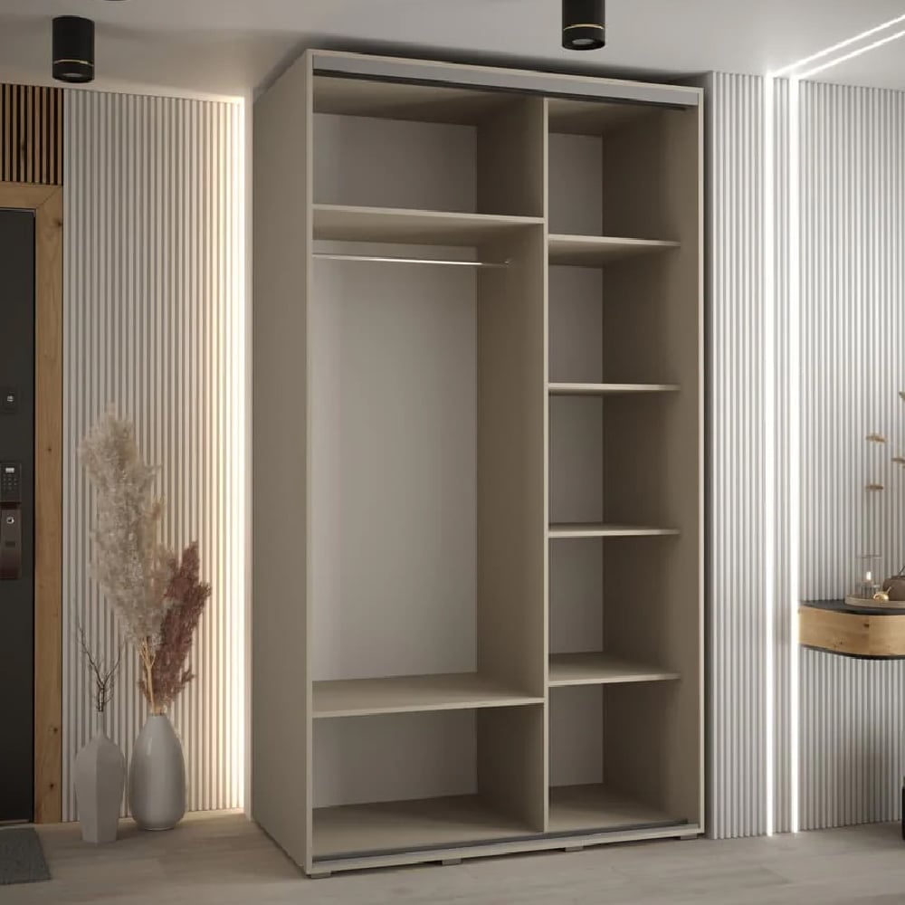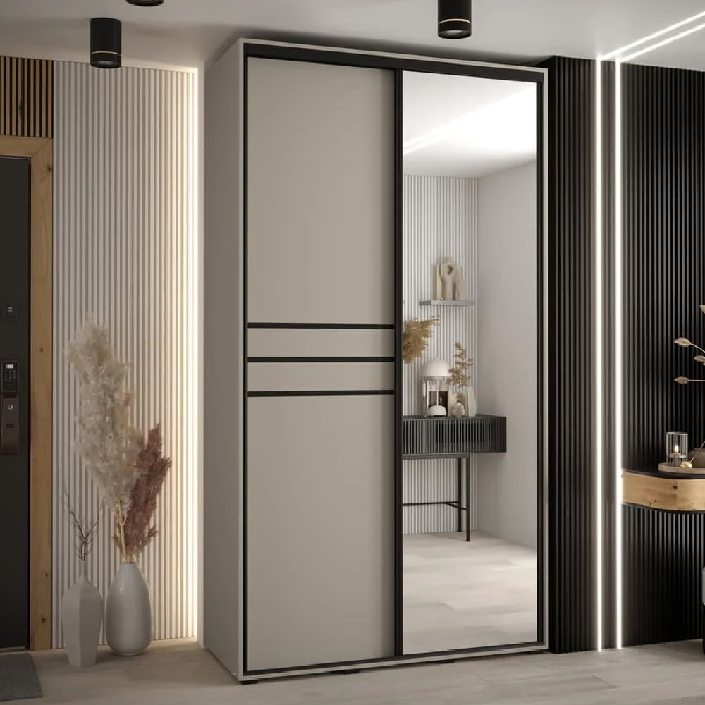 The Delta wardrobe uses clean vertical lines and a neutral cashmere tone to achieve a timeless, contemporary presence. The mirrored panel serves both a functional and spatial role—allowing for full-length reflection while visually expanding the room.