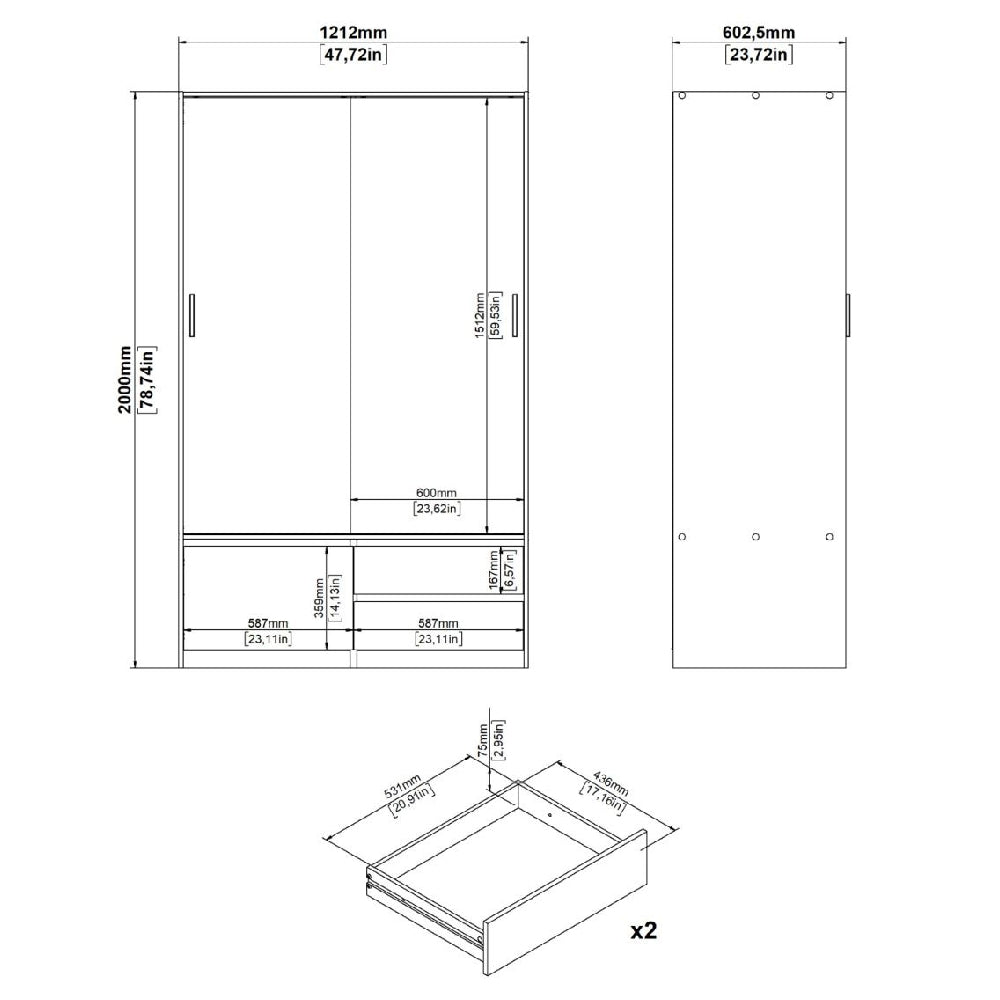 The smooth-gliding sliding doors make it ideal for smaller or compact spaces, providing effortless access without requiring extra clearance. Inside, a spacious hanging rail keeps your garments crease-free, while two lower drawers offer additional room for folded clothes and accessories. The robust laminated board construction ensures long-lasting durability, scratch resistance, and easy maintenance — perfect for everyday living.