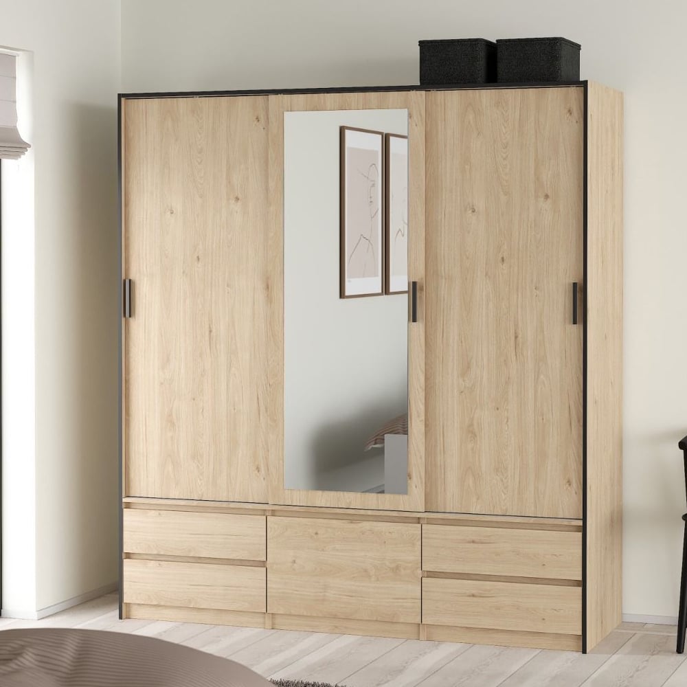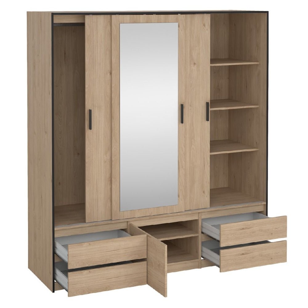 A: It combines an industrial oak finish with a mirrored centre door, blending modern design with natural warmth.
