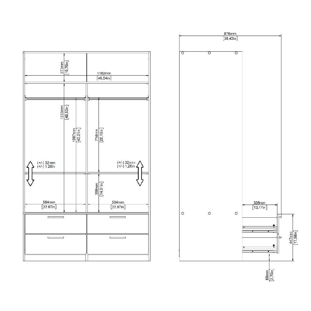 Inside the Lebanon wardrobe, hanging space is provided for everyday garments, while four integrated drawers offer separate storage for folded clothing, accessories, or smaller items. This layout keeps frequently used items organised and easy to access, reducing the need for additional bedroom furniture. The combination supports efficient daily routines without clutter.