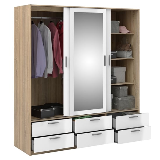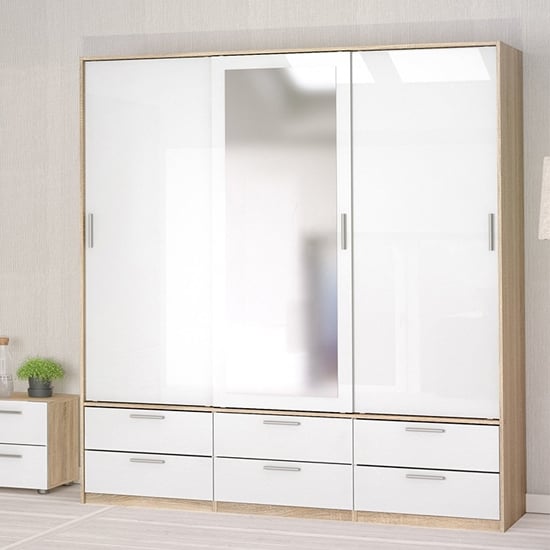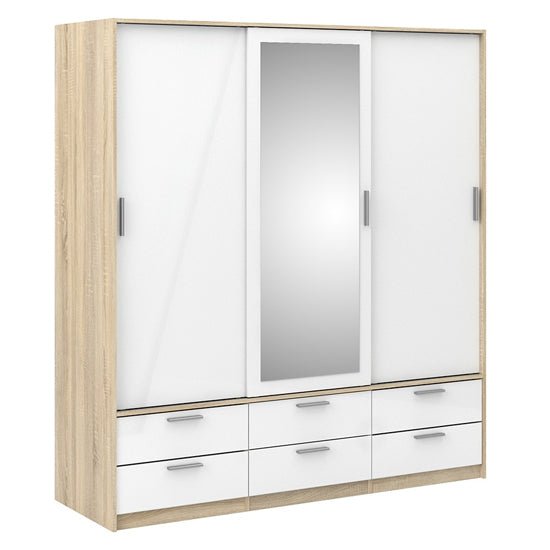 CHOICEWARDROBE Liston Mirrored Sliding Door Wardrobe – Oak & White Gloss Finish with 6 Drawers