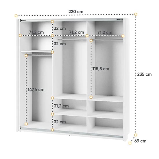 Behind the doors, the internal layout is carefully segmented for real-world organisation. Eight shelves provide structured zones for folded garments, storage boxes, and accessories, while three full-length hanging rails allow separation between everyday clothing, longer garments, and seasonal pieces.