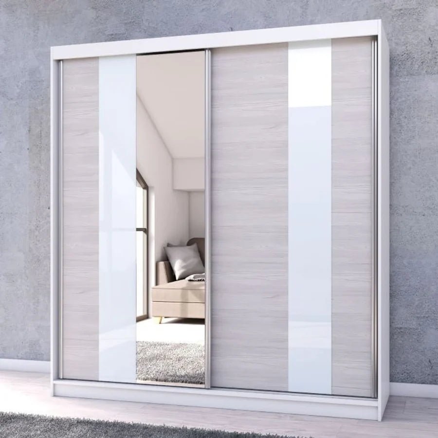 Designed to make an impact, the Monaro wardrobe features a matt white frame complemented by light oak and glossy white door panels for a refined, layered look. A full-length mirrored door enhances light and space, making rooms feel brighter and larger. Behind the smooth-sliding doors lies a spacious interior equipped with four shelves, a wide hanging rail, and a full-height compartment — ideal for storing clothes, accessories, and essentials with ease.