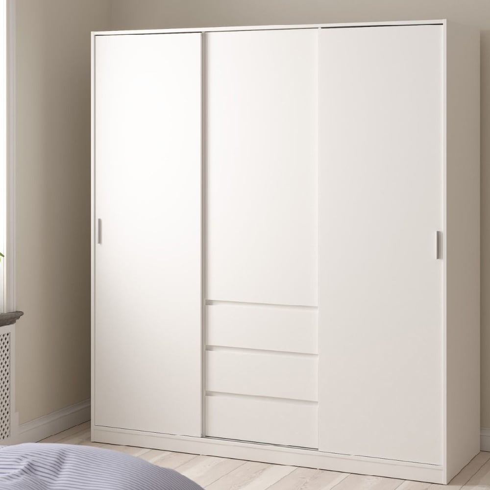 The Nakou features two smooth-gliding sliding doors and three spacious drawers, combining generous hanging space with flexible storage for folded garments and accessories. The pristine white finish enhances light and space, while its durable laminated build ensures longevity and resilience. Ideal for both compact and open bedrooms, the Nakou brings clarity, balance, and functionality to your home.