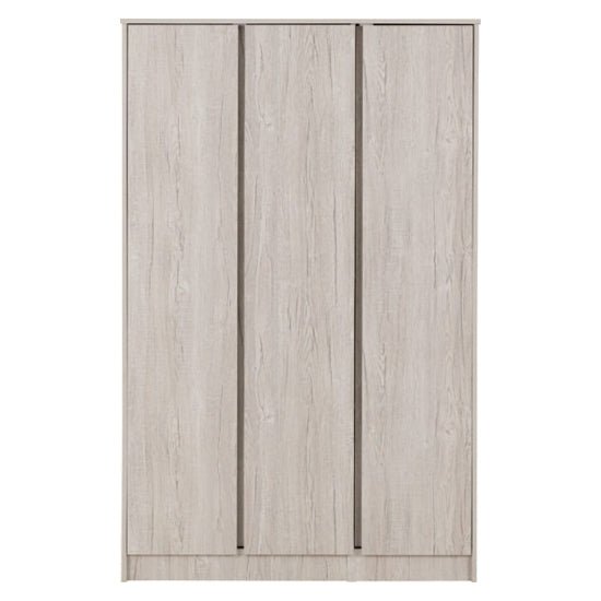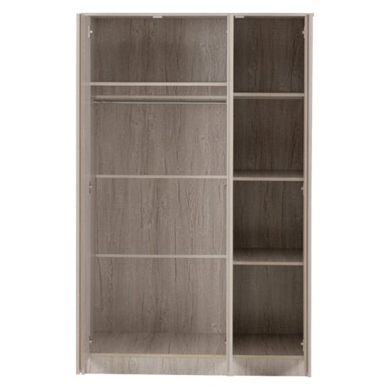 The three-door configuration creates a balanced front elevation while allowing the interior to be intelligently divided. This makes the wardrobe especially suitable for shared bedrooms or households that prefer clear separation between hanging garments and folded storage.