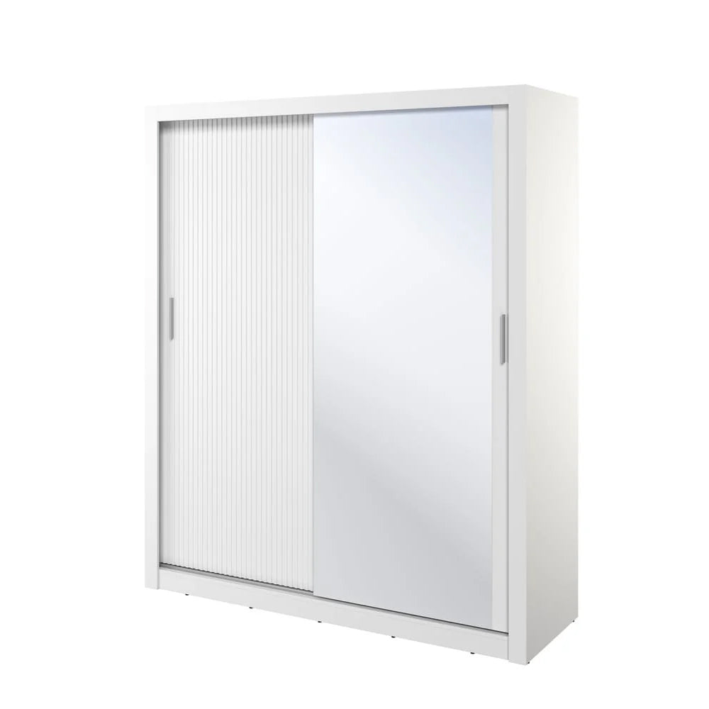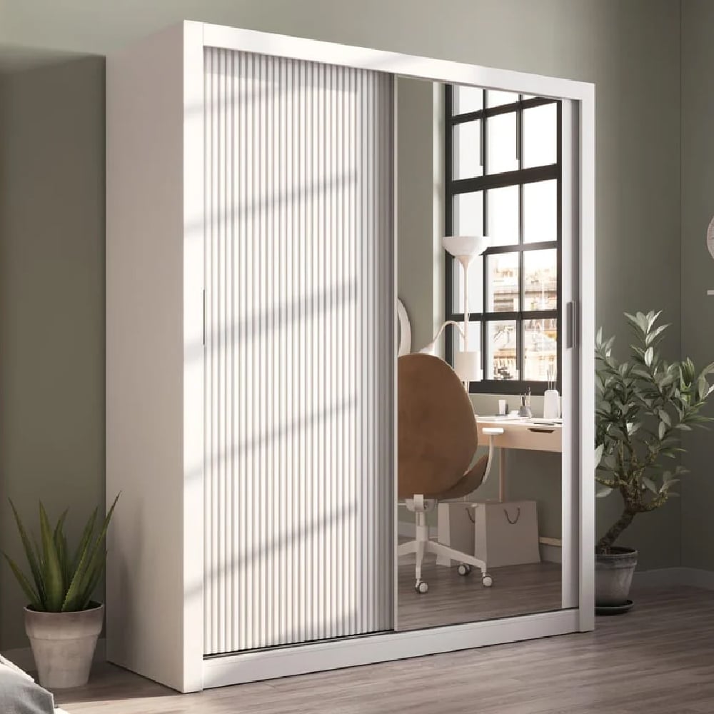 Bring light and modern elegance to your bedroom with the CHOICEWARDROBE Allen 160cm 2 Door Sliding Mirrored Wardrobe in a pristine White Gloss Finish. This beautifully balanced piece combines smooth mirrored panels with subtle ribbed detailing, creating a timeless centrepiece that complements both minimalist and luxury interiors.