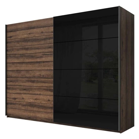 The door layout pairs warm Monastery Oak with high-gloss black glass, balancing natural grain with a sharp, modern surface. This contrast reduces visual bulk across the full width while maintaining a strong horizontal presence. The sliding mechanism keeps the footprint clean, making the wardrobe suitable for larger bedrooms where uninterrupted wall lines matter.