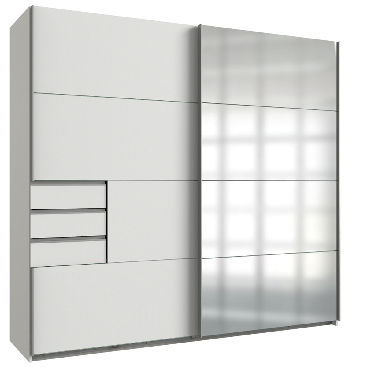 A: One full-length mirrored door is included, paired with a matching white gloss door for a modern contrast. -