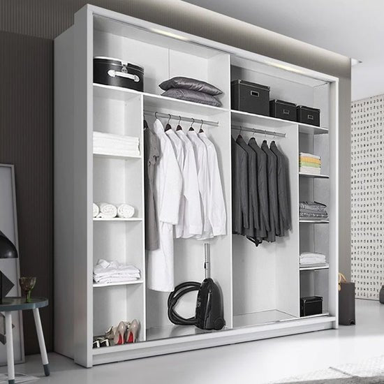 Redefine your bedroom’s atmosphere with the CHOICEWARDROBE Allen 220 cm Mirrored Sliding Wardrobe in Matt White — a perfect balance of modern elegance, premium lighting, and functional organisation. Its minimalist white finish, mirrored panels, and integrated LED light combine to create a sophisticated centrepiece for contemporary interiors.