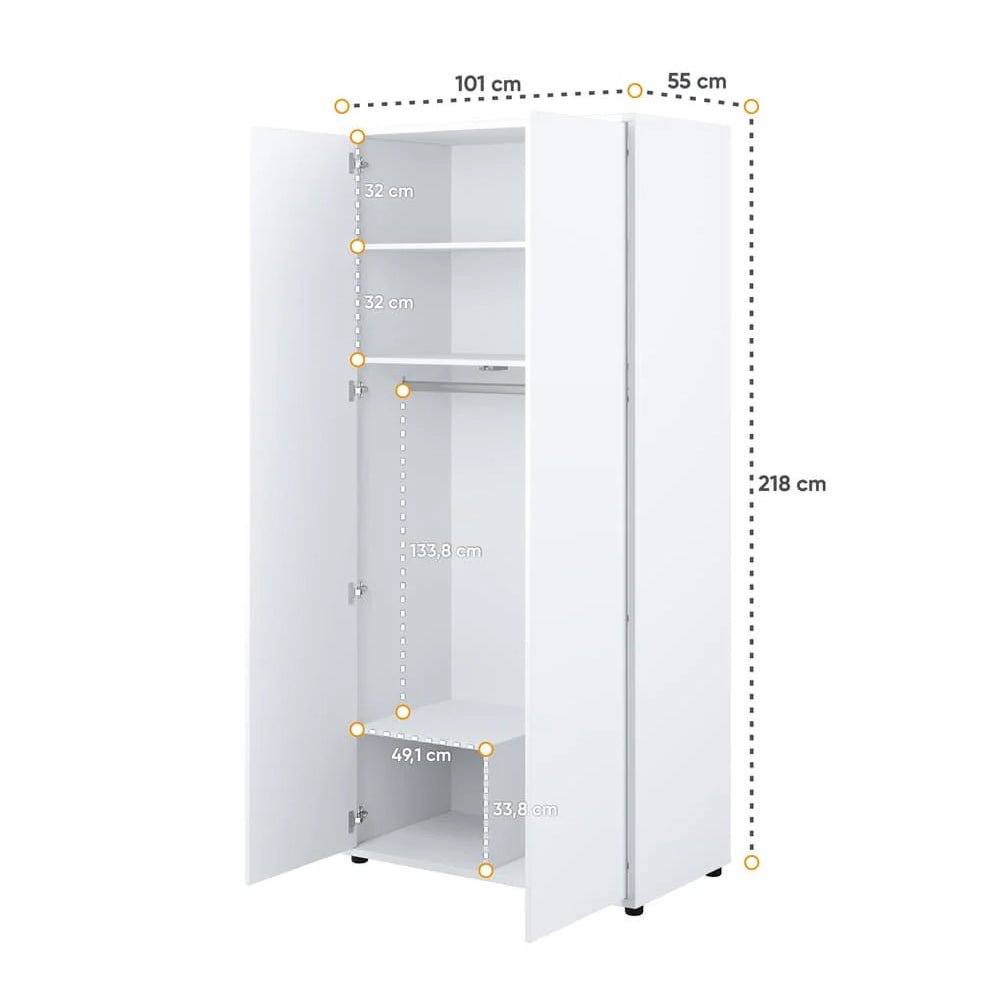 The front is arranged as two hinged doors with a push-to-open system, removing external handles and keeping the door layout clean and uninterrupted. This also allows the wardrobe to sit comfortably in tighter layouts without snag points.