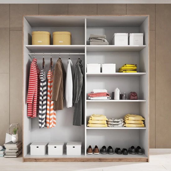 Inside, the wardrobe is configured for everyday usability. Five internal shelves provide structured space for folded garments, shoes, and accessories, while the full-length hanging rail accommodates coats, dresses, shirts, and longer items with ease. The balanced layout supports both single and shared bedroom use.