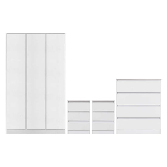 The CHOICEWARDROBE McGowen 4 Piece Bedroom Furniture Set in Matt White delivers a complete, modern and coordinated storage solution for contemporary UK homes. Featuring a spacious 3 door wardrobe, a deep chest of drawers and two matching bedside cabinets, this set brings clean styling, practical storage and a bright, minimalist aesthetic to any bedroom.