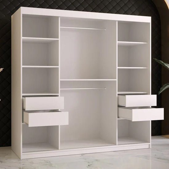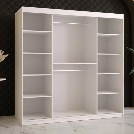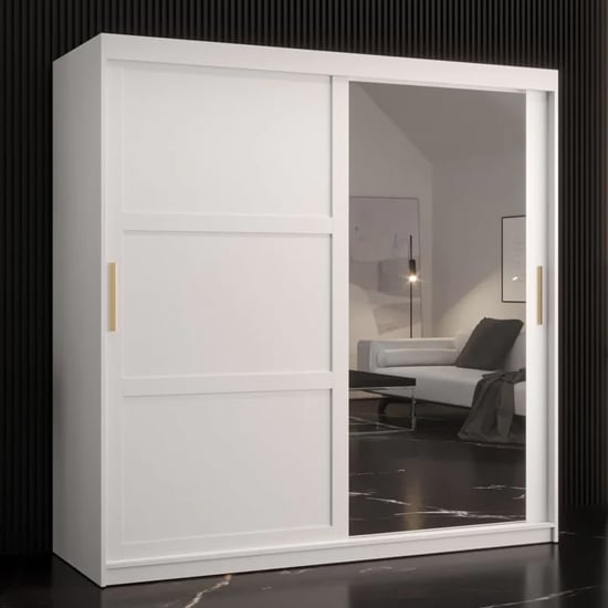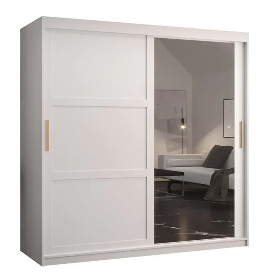 The Rieti wardrobe combines a crisp matt white body with panelled door detailing and stylish gold handles for a soft luxury feel. One mirrored door enhances room brightness and provides convenient full-length reflection. Its smooth sliding system ensures quiet, space-efficient operation—making it ideal for modern apartments, minimalist bedrooms and contemporary homes.