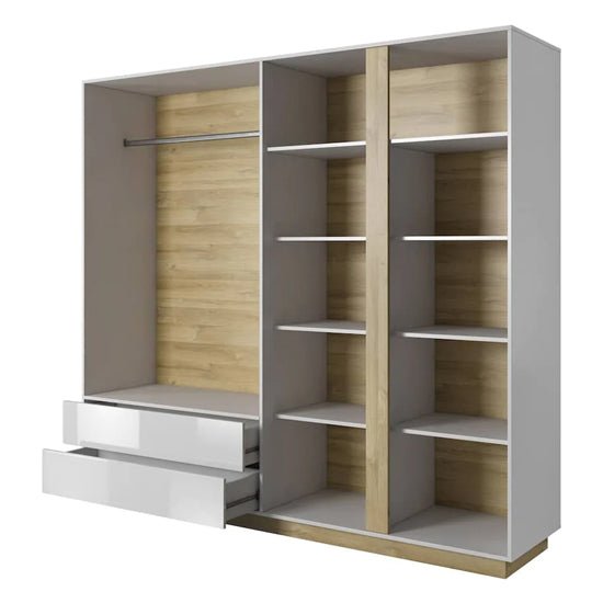 The CHOICEWARDROBE Alaro High Gloss White Mirrored Wardrobe is designed for bedrooms that demand clarity, symmetry, and modern luxury. Finished in a crisp white high-gloss surface with refined oak detailing and subtle gold accents, this four-door wardrobe delivers both visual authority and everyday functionality.