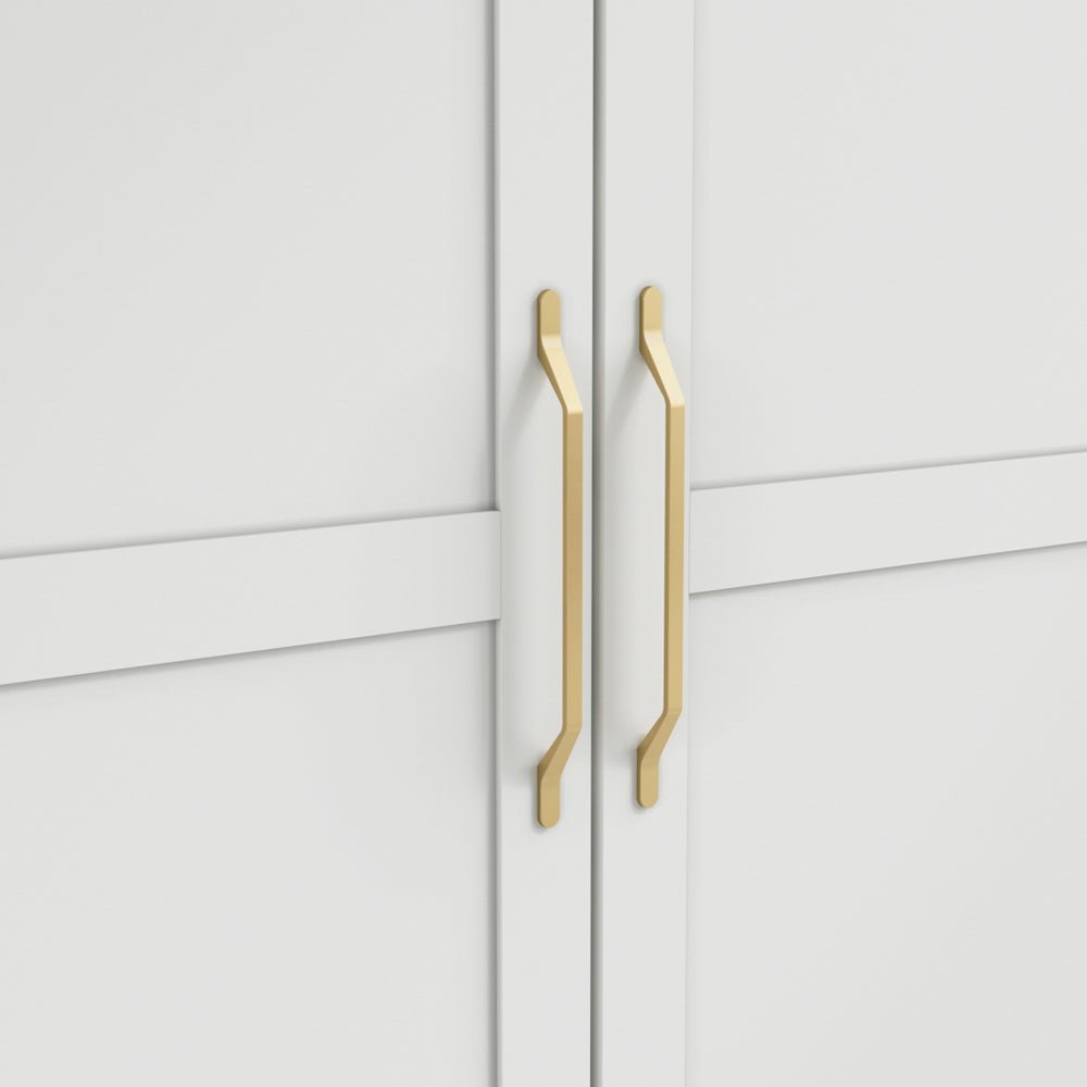 Defined by shaker-style paneling and brushed brass hardware, the Allen wardrobe introduces understated elegance into the bedroom. Its clean white finish enhances light and space, making it particularly effective in both compact and larger rooms.