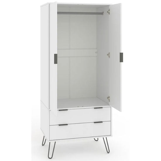 Compact and practical, this industrial look wardrobe offers plenty of drawer space along with a generous hanging space, all finished in stunning white finishes in easy to clean melamine with plastic pull handles and metal feet.