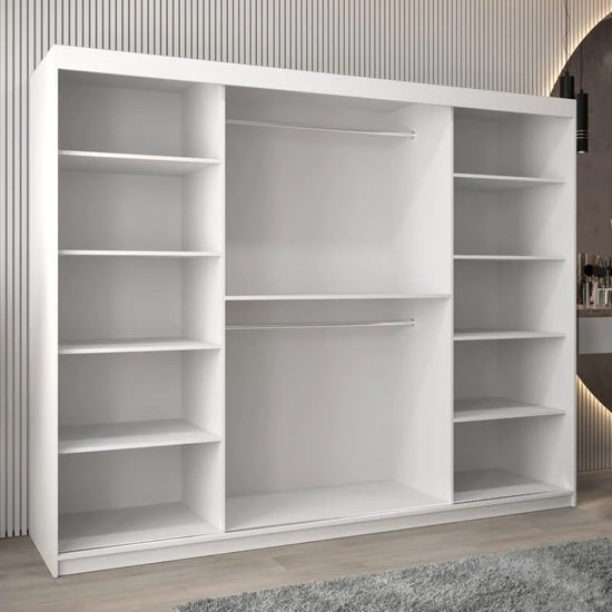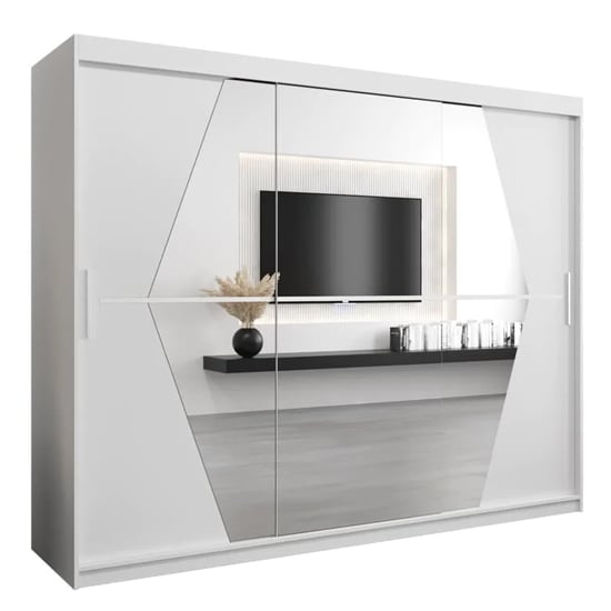Why is the Beloit 250cm wardrobe designed with three mirrored sliding doors in white?
