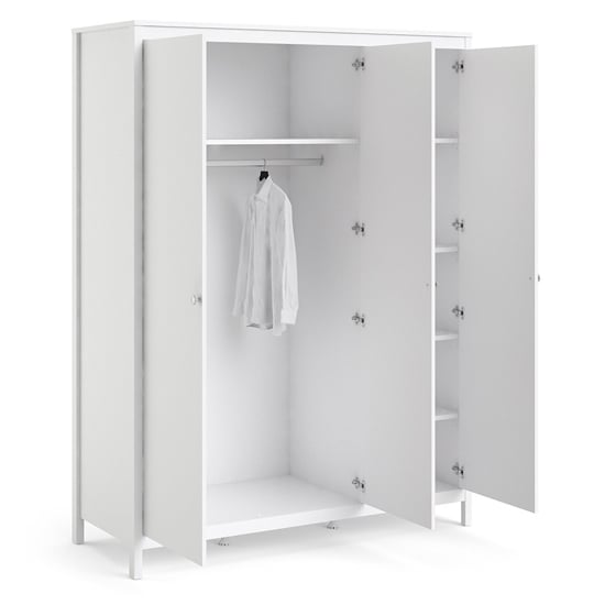 Enhance your bedroom with the Furniture in Fashion Macron Wooden Wardrobe, a stylish and practical storage solution designed for modern living. Featuring a sleek White finish, this wardrobe brings a bold and contemporary touch to any interior while offering ample storage space for clothing, accessories, and essentials. Its three-door design ensures easy organization, making it a must-have for a clutter-free bedroom. Crafted from high-quality wood, the Macron wardrobe is built for durability and long-lasting use. Inside, it features a spacious hanging rail and multiple storage sections, allowing you to keep your garments neatly arranged. The minimalist design, combined with sleek metal handles, complements a variety of bedroom styles, from modern to industrial. Whether you're looking for functionality or aesthetics, this wardrobe delivers both. Upgrade your bedroom with the Furniture in Fashion Macron Wooden Wardrobe, a perfect combination of style, functionality, and premium craftsmanship, designed to keep your space organized and elegant. FEATURES : Material : Wooden Finish : White Innovative 3 door wardrobe in White by Macron collection, designed to transform your bedroom into an organised haven With three spacious doors, it offers plenty of room to store clothes, shoes, and accessories, keeping your space tidy and clutter free The sleek, black finish brings a contemporary charm to your room, easily complementing a range of interior styles The three doors provide ample hanging space and multiple shelves, giving you plenty of room for all your wardrobe essentials Built from high-quality materials, this wardrobe is designed to withstand daily use, offering you reliable storage for years The stylish black finish gives a modern look to your bedroom, adding elegance while maintaining a clean and minimalist aesthetic Internal shelving and hanging rods help keep your clothes and accessories neatly arranged, making it easy to access what you need without hassle The smooth, matte finish is simple to wipe down, ensuring your wardrobe stays looking pristine with minimal effort High quality laminated board (resistant to damage and scratches, moisture and high temperature) Made from PEFC Certified sustainable wood Metal handles Easy self assembly Easy gliding drawer runners Adjustable hinges on all doors Available at an affordable price Images shown are for illustration purpose onlyDIMENSIONS : Height : 199cm Width : 149.8cm Depth : 58.4cm