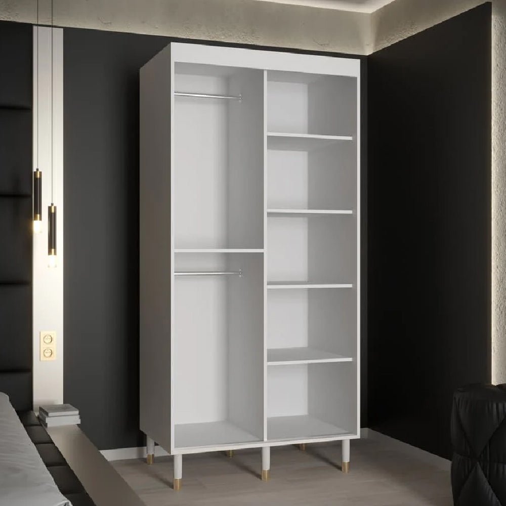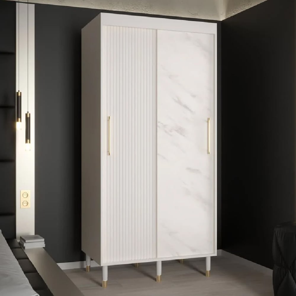 Maximise your storage in style with the CHOICEWARDROBE Millwall 100cm White Marble-Effect Sliding Wardrobe — a compact yet luxurious design combining elegant ribbed marble panels, gold handles, and smooth-glide doors. Its minimalist white finish brightens any space, ideal for modern apartments, guest rooms, or bedrooms where space efficiency matters.